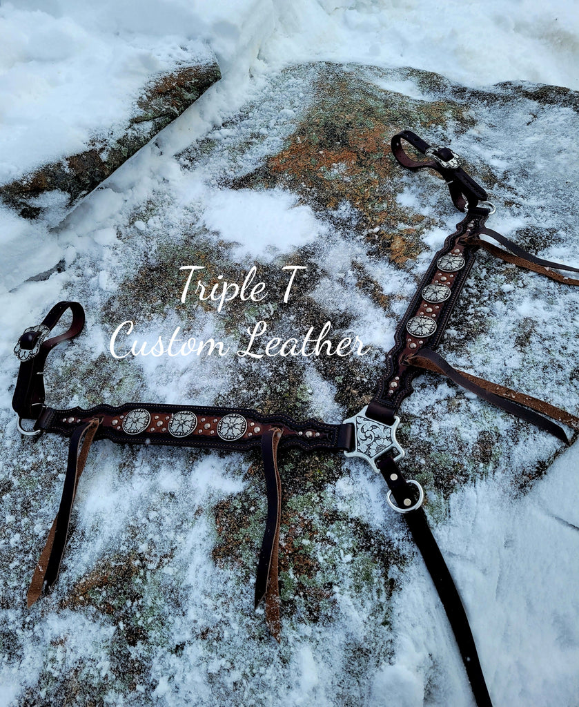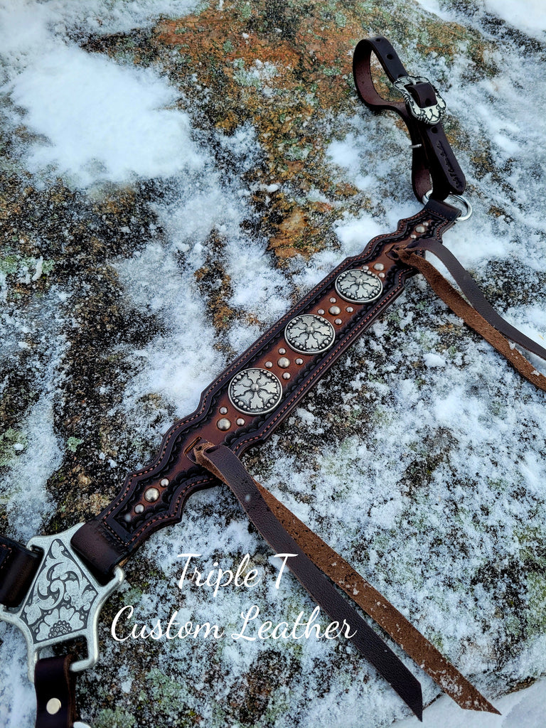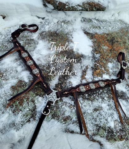 Classy looking concho breastcollar with antique silver hardware and studs. Two tone chocolate and light brown dye and handtooled border. Chocolate blood knot tassles. Average horse size