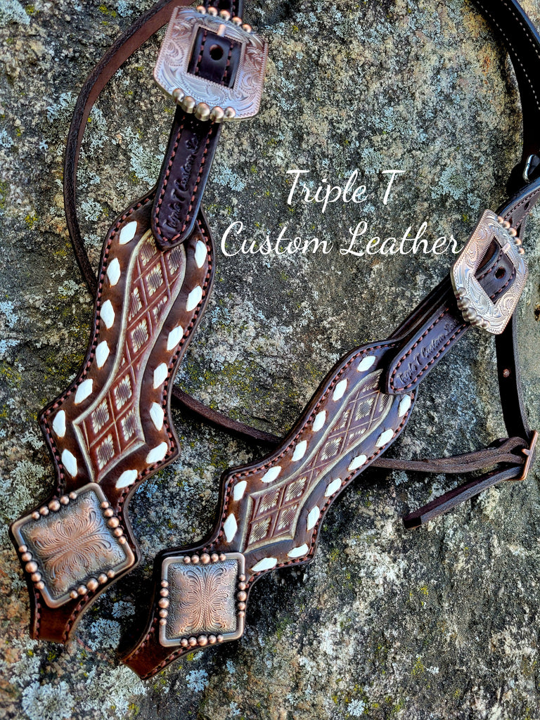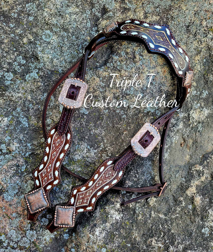 Chocolate Leather with a unique aztec diamond tooling. The white wash over the tooling really makes the design pop! Complimented with white buckstitch and copper conchos & buckles.
