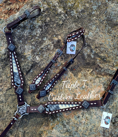 Chocolate Leather Tack Set with Grey & White Wool Inlay & White Buckstitch