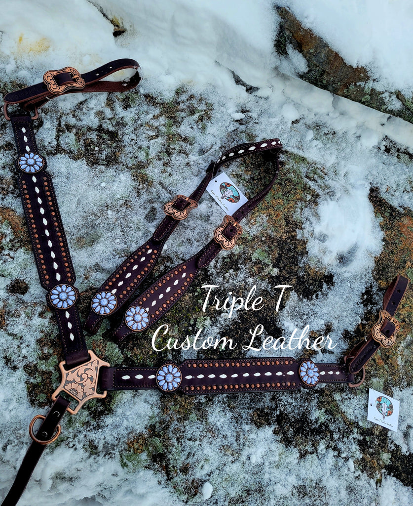Simple & Classy! Chocolate Leather set with white buckstitch, copper stud border and hardware and our new copper & white stone daisy conchos. Average horse size.